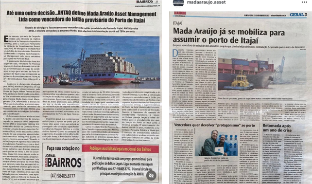 MADA ARAUJO ASSET & PORT MANAGEMENT LTDA, saiu vitoriosa no PROCESSO SELECIONAL ANTAQ 001/23 no Porto de Itajaí-SC, segundo porto em volume de contêineres do Brasil. Negociada em maio/2024 a transferência de operações à SEARA OPERAÇÕES LOGÍSTICAS LTDA, GRUPO JBS.